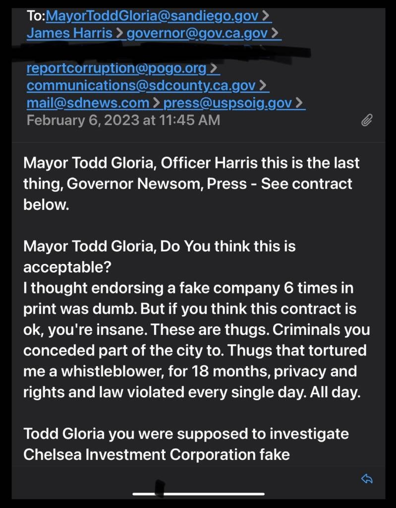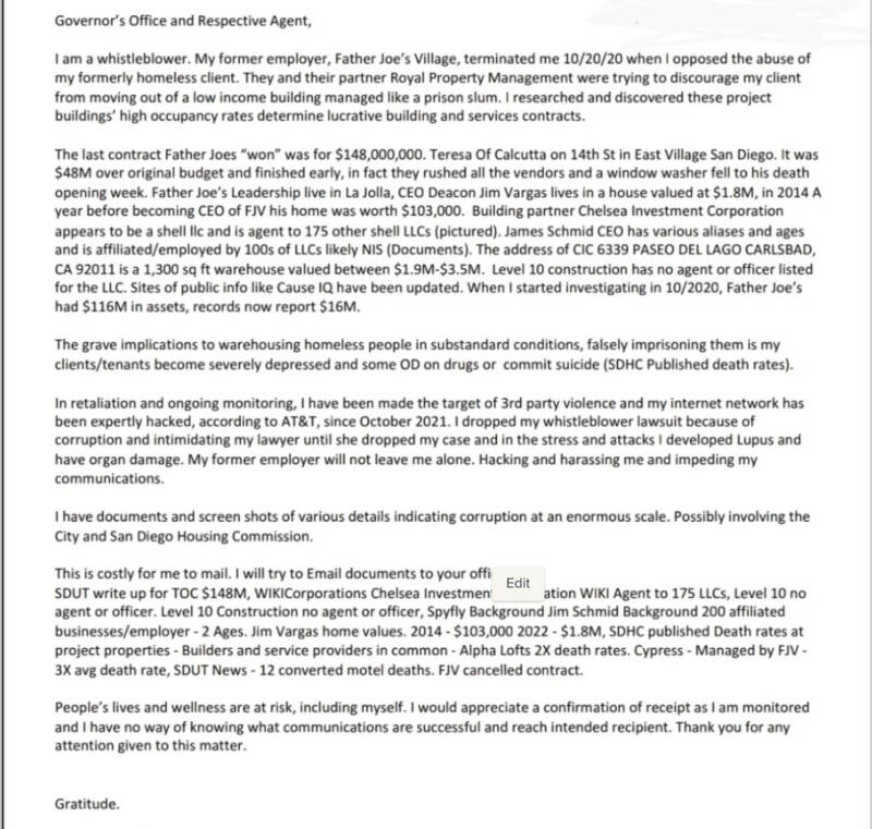 I wanted my clients out of these buildings or safe from these people in the least. July of 2022 I reported my whistleblower, findings and grim experiences to Mayor Todd Gloria.